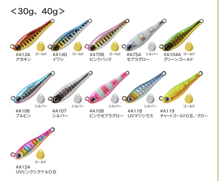 サイズ展開は5種類の20g、30g、40g、50g、60gとなっており、水深やベイトサイズにより使い分けることができます。